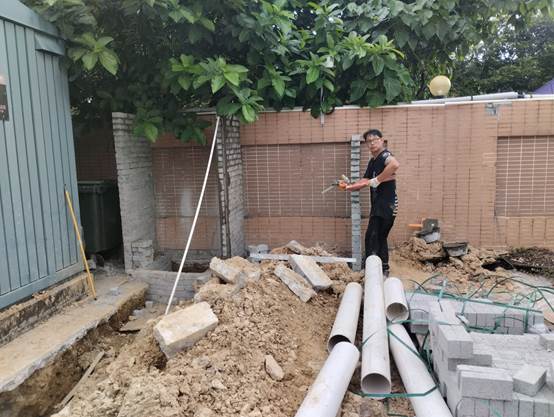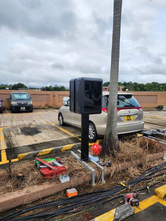 - 基礎建設與電纜鋪設:由於本次安裝位於戶外停車場,須鋪設兩條獨立裝甲電纜,確保充電樁運行穩定。精英師傅A1W首先開挖地面,埋設裝甲電纜,並為每個車位預留獨立供電接駁點。地面回填及修復,確保施工後地面結構完整,並符合安全標準。