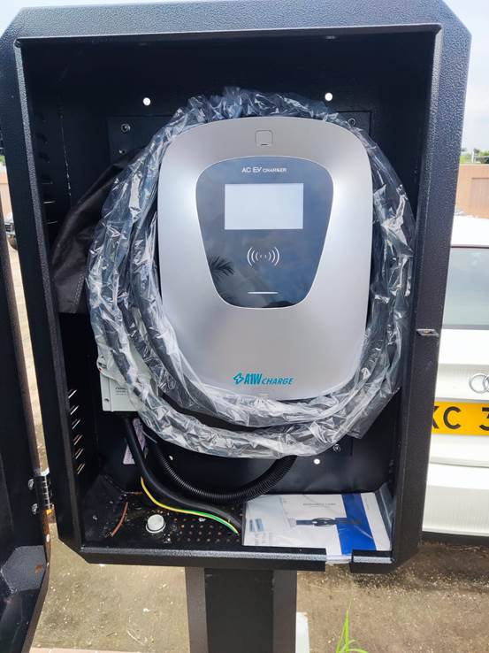 - 充電樁安裝與安全防護:由於車場為戶外環境,本次安裝的數十台充電樁皆採用立柱式設計,確保設備穩固耐用。為提升設備安全性,每台充電樁均配備不鏽鋼保護箱。